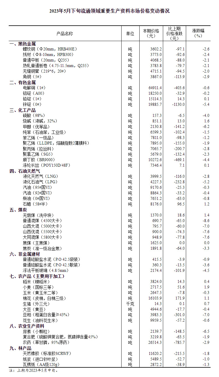 2023年5月下旬流通领域重要生产资料市场价格变动情况