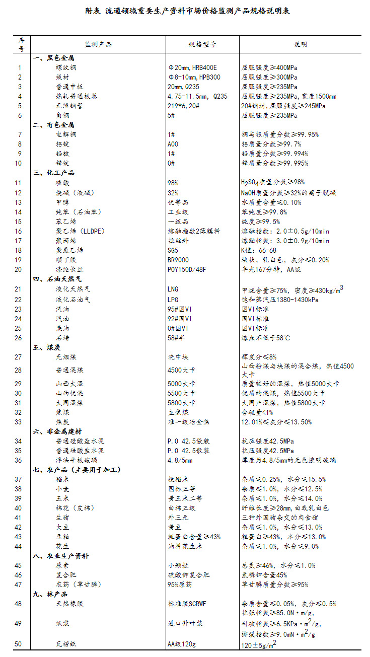 流通领域重要生产资料市场价格监测内容包括9大类50种产品的价格。类别与产品规格说明详见附表。