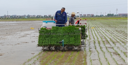 基地大田正在进行早稻、再生稻无人驾驶插秧作业,无人驾驶插秧系统通过自行规划最优路线、智能化数据分析定位、精准控制行距和苗距,现场秧苗稳定有序排列插秧,大幅度提高插秧自动化水平和作业效率。同时搭载水稻侧深施肥机,充分发挥农机农艺融合优势,在插秧的同时精准高效均匀施肥,提高肥料利用率,在缩短缓苗期促进根系生长增加水稻产量的同时,减少施肥次数和肥料用量,降低人工投入和养分损失,促进化肥减量增效和农业绿色高质量发展。