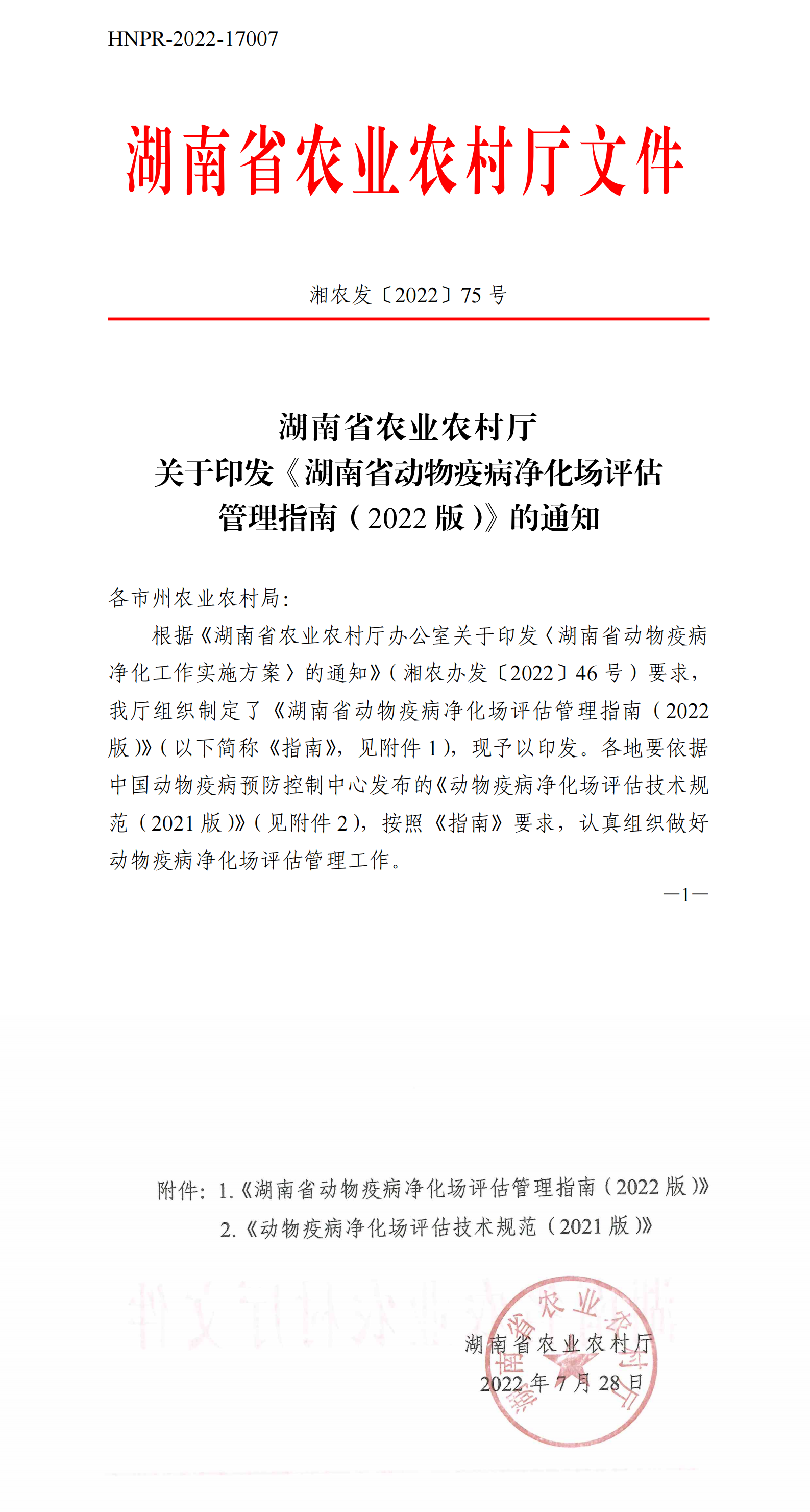 湖南省农业农村厅关于印发《湖南省动物疫病净化场评估管理指南(2022 版)》的通知